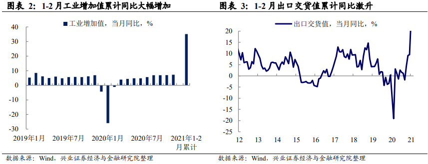 生产表现较好,出口是带动生产的重要因素。2021年1-2月,工业增加值累计增速超市场预期,将2020-2021年两年平均来看增长8.1%,比2019年同期高2.8个百分点。从内外需数据来看,强生产格局受外需推动较多,2021年1-2月出口(美元计价)同比激增60.6%,虽然有低基数效应影响,但也受全球经济向好+供应链恢复支撑。且“就地过节”对生产可能也产生了积极影响。