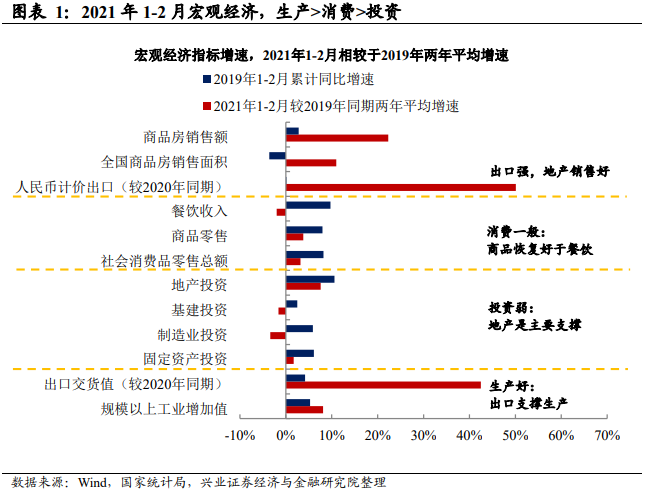 2021年1-2月经济整体表现:生产>消费>投资,外需和地产是主要拉动。