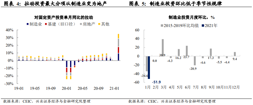 固定资产投资不及预期。2021年1-2月,固定资产投资累计同比35%,不及预期,较2019年同期,固定资产投资两年平均增长1.7%,比2019年同期低4.4个百分点。与前期比较,拉动投资的最大分项从制造业投资变为地产投资。
