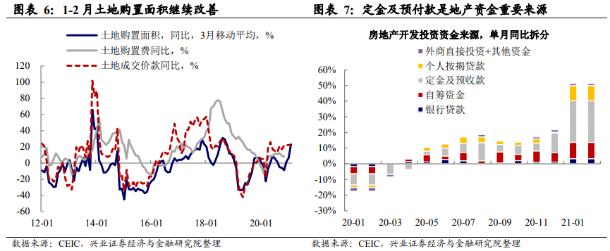 地产投资是主要支撑,韧性较好。2021年1-2月,较2019年同期,地产投资两年平均增长1.7%,较2019年同期要低3.0个百分点。房地产投资是投资三大分项中唯一同比读数为正的分项。从土地购置看,土地购置面积同比仍在继续改善,反映地产商拿地意愿有所改善。地产资金来源中,定金及预付款同比拉动仍是最大分项,反映地产需求端资金来源不差。整体来看,地产整体仍表现出较好韧性。