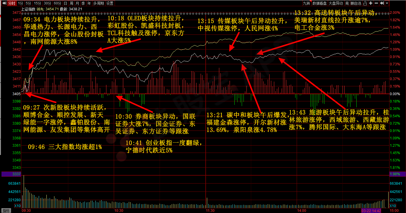 周末高层讲话提振市场信心,今日三大指数开盘后迅速走高,创业板指较为强势,一度涨逾2%,沪指和深成指跟随上扬,碳中和、次新股板块集体发力。此后指数冲高回落,创业板指、深成指一度翻绿,随后又震荡回升。午后两市整体维持高位震荡格局,沪指围绕5日线窄幅波动,个股呈现普涨行情。临近收盘,指数延续反弹。
