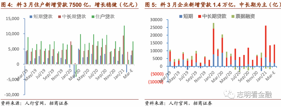 料增量信贷结构较好。由于个人经营性贷款及消费贷政策略微收紧,我们预计3月住户短期新增贷款3000亿,中长期+4500亿,合计+7500亿。经济明显好转,企业融资需求旺盛,预计3月企业新增贷款1.4万亿,其中,中长期+1.2万亿,短贷+2000亿。信贷需求旺盛而额度偏紧,预计票据融资零增长。