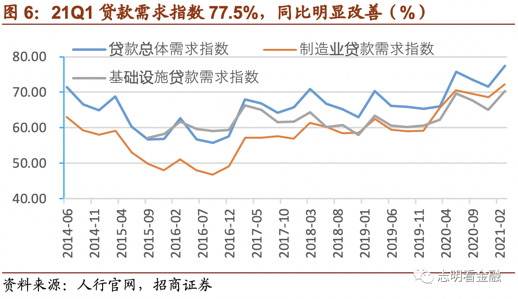料3月新增贷款2.15万亿,虽较20年3月的2.85万亿明显少增,但却是去年以外3月历史同期最高。为对冲疫情冲击,20年上半年政策鼓励加大信贷投放,当年3月信贷投放大幅放量。相较于19年3月1.69万亿元的新增贷款,21年3月亦有27%的增长,我们认为该规模并不低。由于稳杠杆等,预计1Q21新增贷款7.09万亿,同比相当。依据央行银行家调查,21Q1贷款需求指数77.5%,同比明显改善,为14Q2以来最高,信贷需求旺盛。
