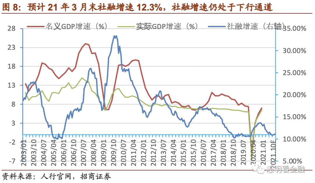 料3月社融增速明显下降。我们预计3月社融增速大幅降至12.3%,主要系高基数影响。考虑到,经济好转及稳杠杆之需要,我们预计全年社融33万亿左右,社融增速11%出头。由于20Q2社融较高,预计21Q2社融增速继续下行。