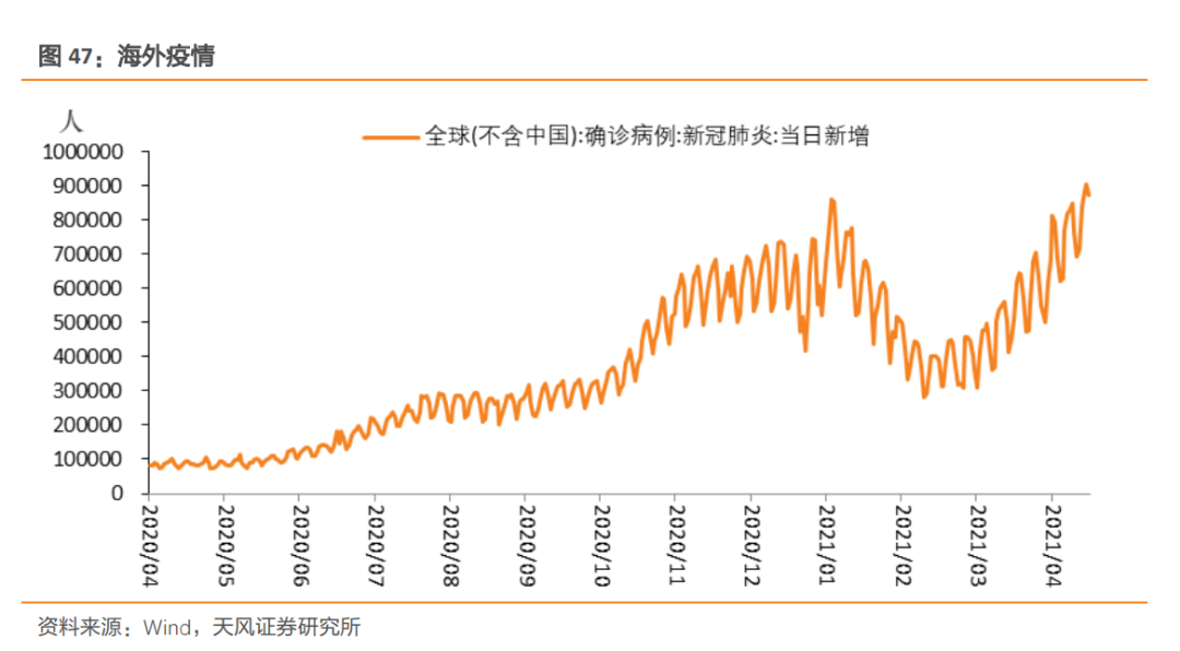 3月以来海外疫情再度反弹,当日新增确诊病例数已经超过前期高点,疫苗相对缺乏的印度、巴西等新兴经济体成为本轮疫情爆发的主要发生地。欧洲方面,德国、法国疫情也出现了反复。另外,日本疫情也再度恶化(虽然新增确诊病例较其他国家而言并不多),日本政府再次宣布东京都、大阪府、京都府、兵库县4地进入紧急状态。