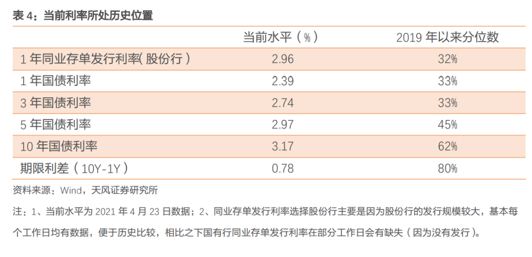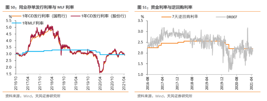 另外,虽然当前1年同业存单发行利率也处于2019年以来前1/3水平,但考虑到去年4-5月在海外央行大幅宽松之下同业存单发行利率曾大幅低于MLF利率(2020年二季度《货币政策执行报告》),如果剔除掉该阶段的影响,那么当前1年同业存单发行利率恰好处于2019年以来中枢位置。