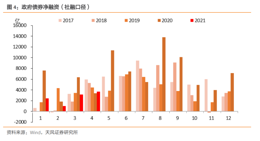 同时,虽然4月政府债券发行和净融资规模均为今年以来最大,但实际上仍弱于往年季节性。政府债券供给压力同比下降,这一方面因为去年发行专项债的政策效果仍在持续释放(如财政部所述),另一方面在两会前后明确专项债项目风险和政府杠杆逐步降低之后,专项债发行节奏确实有所改变。