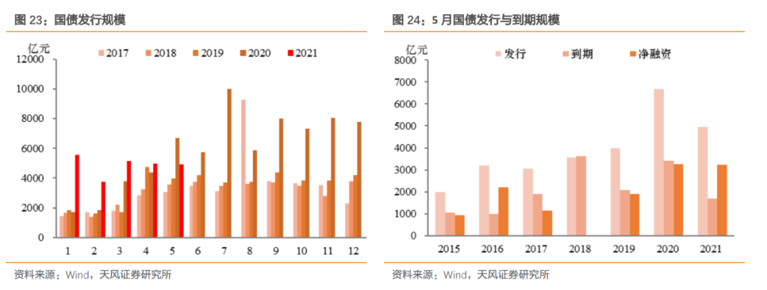 结合过往平均发行规模,我们预测5月国债发行规模约为4940亿元,而到期规模为1703亿元,那么净融资约为3237亿元。
