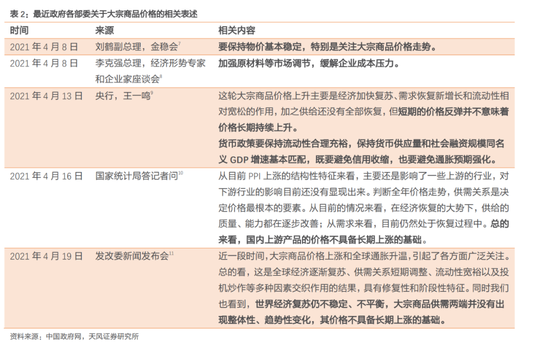 目前政府各部委都在关注工业品通胀/大宗商品价格上涨问题。李克强总理提到会通过加强原材料等市场调节来缓解通胀压力,而对于货币政策而言,央行王一鸣则提到“保持货币供应量和社会融资规模同名义GDP增速基本匹配,既要避免信用收缩,也要避免通胀预期强化”,整体态度相对中性。