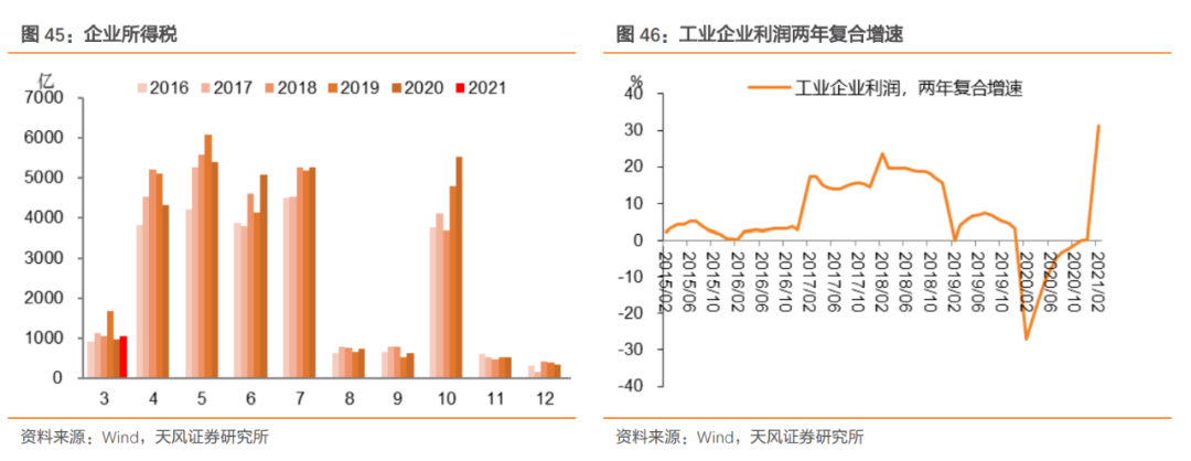 最新数据显示,今年1-2年工业企业利润总额同比增长179%,过去两年平均增长31.2%,明显超过疫情前的水平。此外,今年前3个月税收收入(也包括企业所得税)也基本恢复或高于疫情前的水平,我们预计该情况很可能会延续至5月。