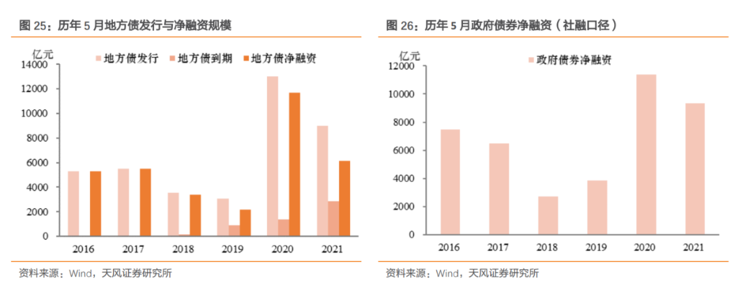 按照财库〔2020〕36号文的要求,如果全年地方债发行节奏较为均衡,那么我们预计5月地方债发行规模约为9000亿,到期规模约为2880亿元,那么地方债净融资约为6120亿元。按照上述预测,5月地方债发行和净融资规模为今年以来单月最大值,但是同比而言仍有所下降,这主要是由于去年同期的高基数(但仍强于2019年及之前的年份)。