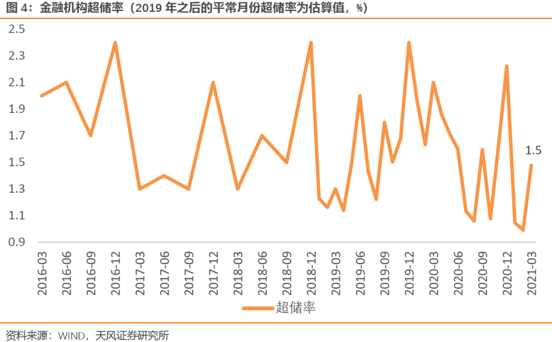 估算今年3月底的银行超储率约为1.5%,高于2017-2019年(2020年情况特殊超储率偏高),与春节后流动性偏松是一致的。参考去年下半年的情况,平常月份的超储率在1.0%-1.1%时对应了略偏紧的流动性环境(8月、10月),在1.6%时对应了较宽松的流动性环境(11月),因此流动性中性(DR007中枢≈2.2%)对应的超储率水平大概在1.2%左右。