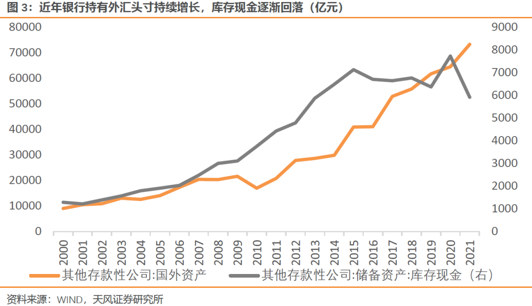(6)外汇占款:去年我国货物贸易顺差规模历史第二,外汇占款却下降一千亿,我们曾在报告《如何理解国际收支变化和外汇占款的关系及影响》里详细讨论了各方面原因,其中之一就是央行在2019年以后逐渐退出了对外汇市场的常态化干预,商业银行一般使用自有资金开展结售汇业务,因此结售汇顺差多在“其他存款性公司”资产负债表上表现为“国外资产”增加、“库存现金”减少,而不一定表现为央行资产负债表中“外汇占款”的增加。