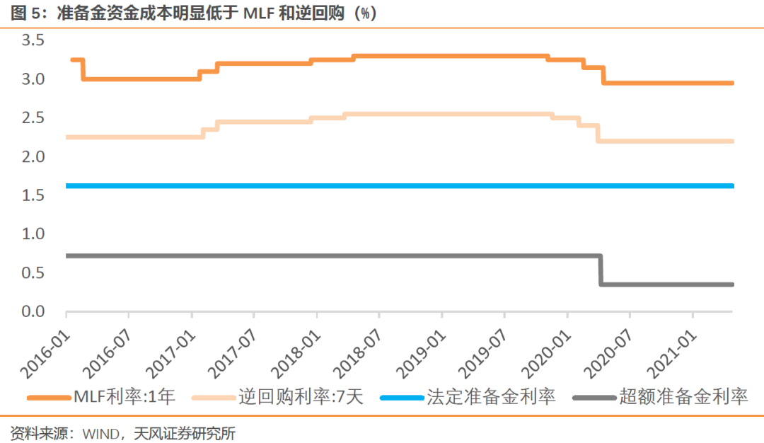 中长期流动性的投放方式主要有三种:一是MLF,当前央行每个月至少投放一次,由于MLF资金成本即央行中期政策利率,接近当前1年期AAA同业存单的利率水平,这种操作偏中性;二是降准,将部分法定准备金转化为超储,由于当前法定准备金利率仅1.62%,明显低于MLF和逆回购利率,属于偏宽松的操作;三是央行通过从银行购进外汇形成外汇占款来投放基础货币,这种操作在2015年汇改后比较少见,但考虑到银行外汇头寸持续上升,这种操作也存在可能性。