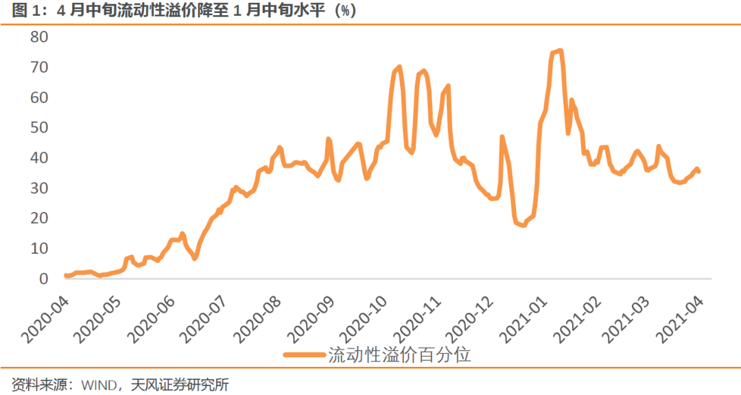4月是传统缴税大月,地方政府债券的发行工作也已经启动,然而在央行至今没有净投放的情况下,4月流动性却维持了春节以来相对宽松的状态,DR007均值低于7天逆回购利率14BP,1年期AAA同业存单利率持续回落,超出市场预期;流动性溢价在4月中旬下降至30%分位附近,接近今年1月中上旬的状态。