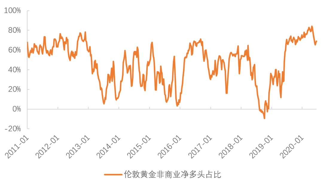 K型复苏和长期失业降低了资金需求,预防性高储蓄以及MMT实践下的货币被动宽松增加了资金供给,实际利率的长期中枢可能系统性低于疫情前,因此黄金的定价中枢可能也会系统性地高于疫情前。期货市场的多头并没有完全撤离,净多头持仓占比虽然有所下降,但仍然在历史较高水平。
