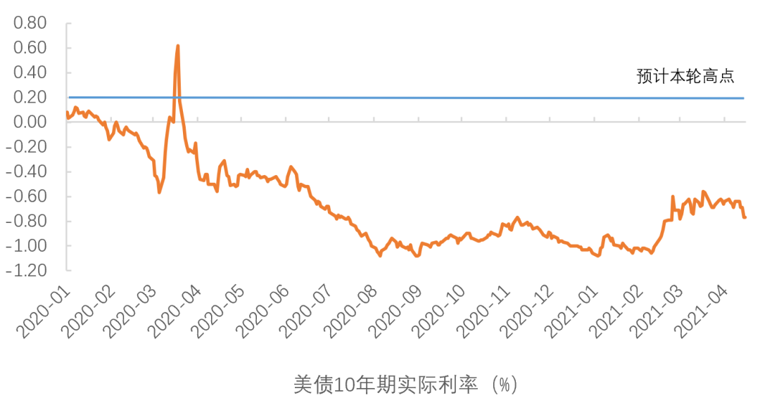 美债实际利率从今年年初开始回升,从目前的情况来看,实际利率还将继续上升,至少延续至今年Q3-Q4。经济方面,美国疫苗接种好于预期,随着服务业的报复性复苏,失业率将加速回落到5%左右(但长期失业恢复缓慢),资金需求将继续恢复。政策方面,美联储购债规模维持不变,下半年可能开始沟通缩减计划,资金供给将边际收紧。预计本轮实际利率的高点在0.2%-0.3%左右,对应70%-80%历史分位,约为2019年的平均水平(详见《本轮美债的几个关键位置》)。今年实际利率继续回升意味着黄金的金融属性将继续下降。