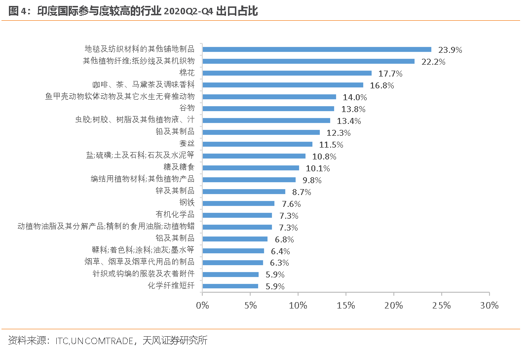 出口贸易方面,我们选定中国大陆、中国香港、中国台湾、美国、欧盟28国、日本、韩国、加拿大、瑞士、澳大利亚、墨西哥、印度、泰国和巴西等14个主要国家和地区为样本,按照出口份额占比筛选印度国际参与度较高的行业。结果显示,印度占国际贸易的绝对比重不高,2020年Q2-Q4出口仅占比2.6%;但在纺织、化工(包含原料药)、农产品、矿产品等行业,印度是全球产业链的重要一环。