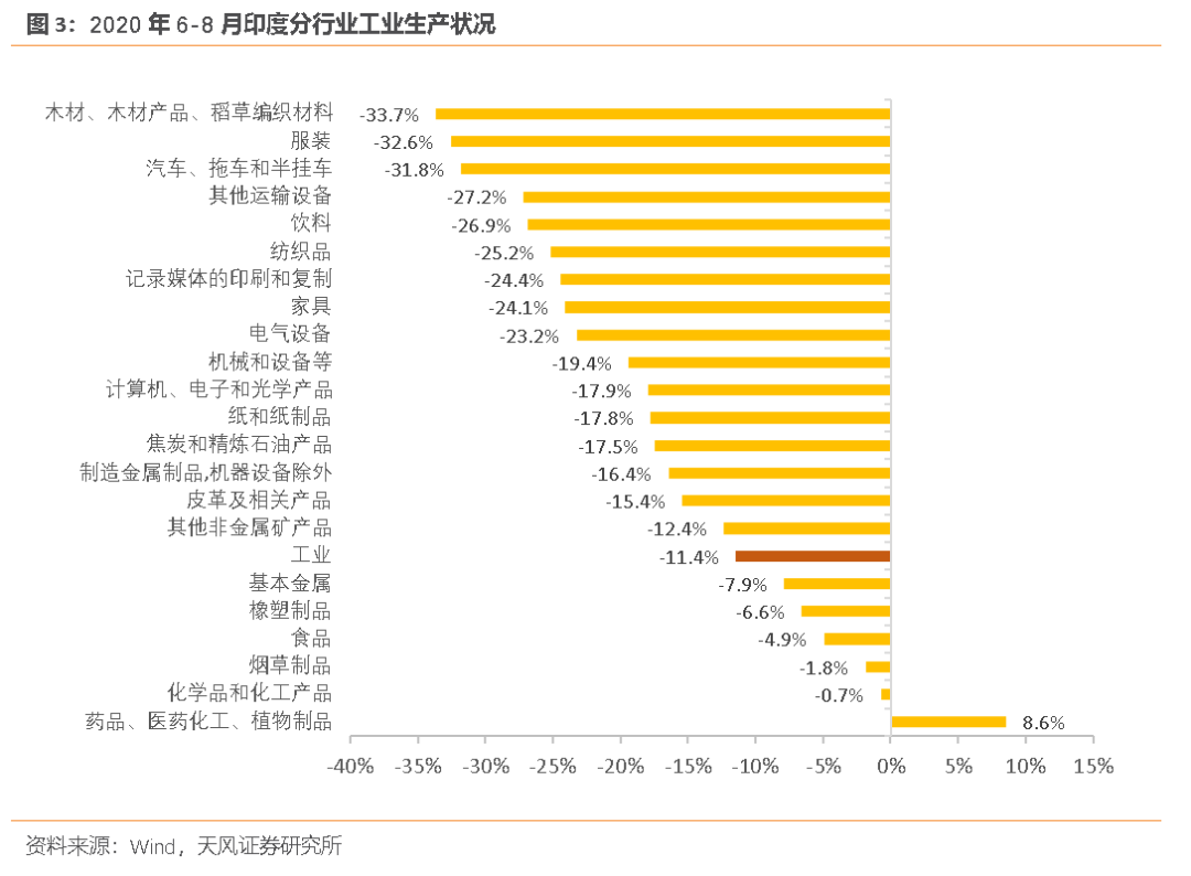 工业生产方面,2020年6-8月印度工业生产指数同比下滑11.4%,其中生产受到较大影响的行业有木材、服装、饮料、纺织品、印刷复制、家具等劳动密集型行业,也有运输设备、电气设备、机械设备等附加值较高的行业;生产较为正常的行业是医药和化工产品,表明印度政府对这类行业支持力度较大。