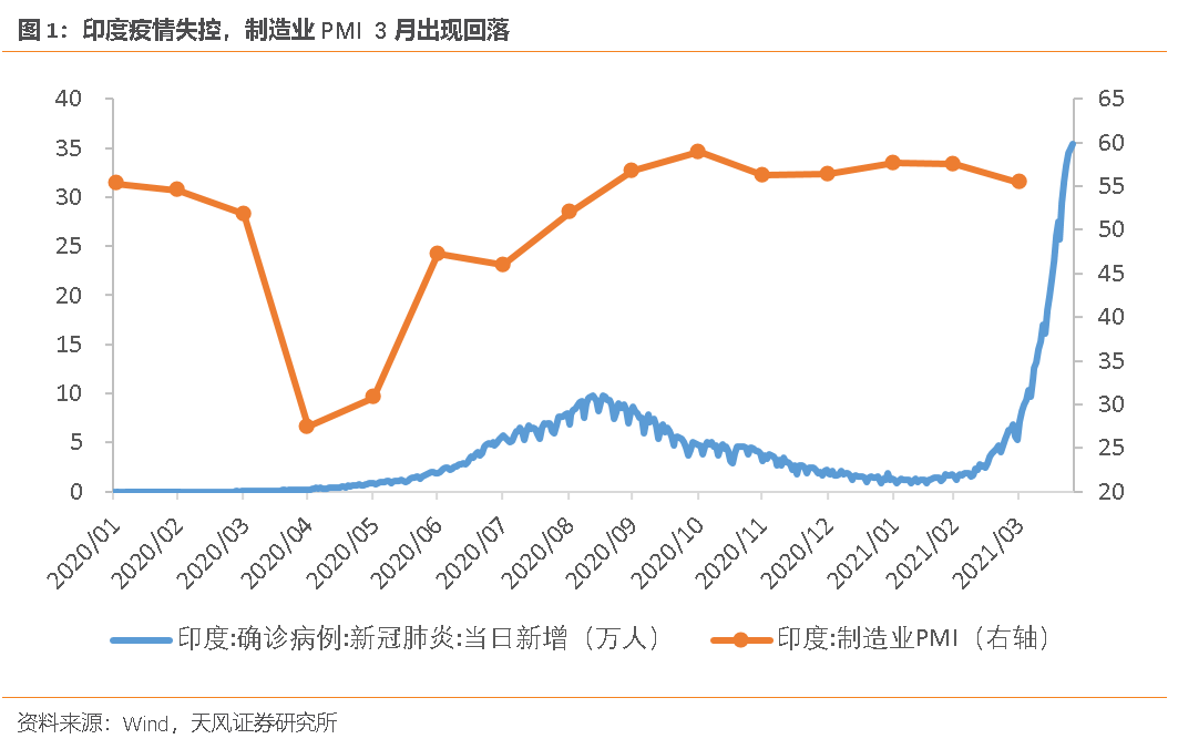 在疫苗接种取得进展、全球生产加速重启的4月,印度疫情出现了急剧恶化。截至当地时间4月27日,印度连续6日单日新增确诊病例保持在30万例以上,刷新了全球单日新增病例纪录;新增死亡病例也达到了疫情暴发以来的新高,医疗资源遭遇严重挤兑。据印度政府预测,这一波新冠疫情可能于5月中旬达到峰值。在新增病例出现增长的3月,印度的制造业PMI已经有所回落;随着疫情的愈演愈烈,印度制造业可能会相对承压。