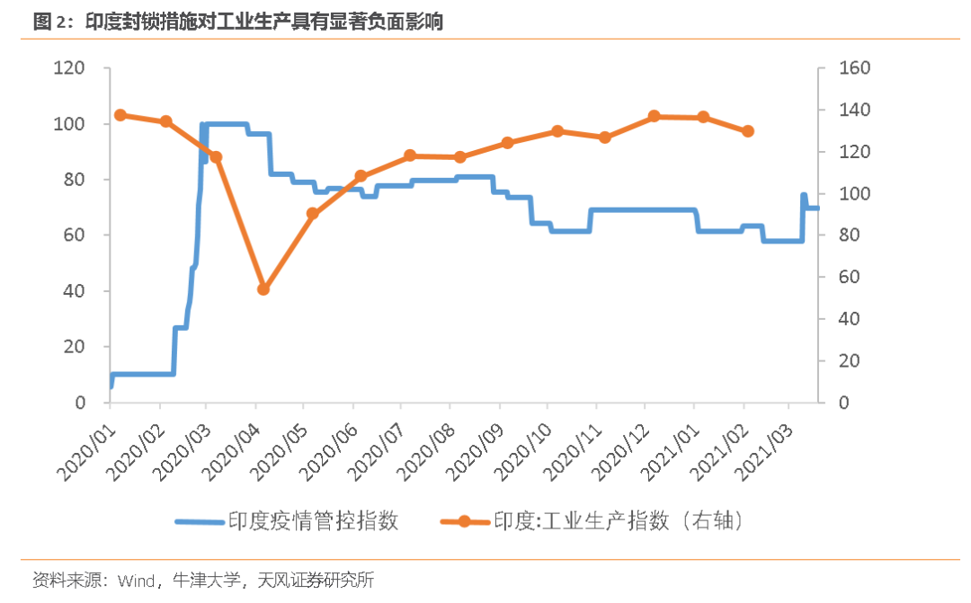 目前看来,市场可能高估了印度疫情失控对全球经济的影响,实际的负面冲击可能并不如市场所预期的强烈。据AEI的最新研究,对于印度等人均GDP水平较低的国家而言,工业生产与死亡病例的关系不高,与封锁强度和海外需求关系较大。假设印度后续封锁措施强度上升至2020年6-8月疫情爬坡时期的水平,考虑到全球需求相比去年的明显复苏,当时印度的工业生产和出口情况可以作为推演后续影响的参考下限。