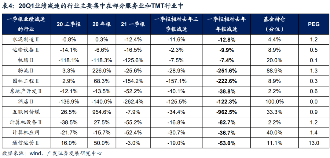 一季报盈利减速的行业主要集中在TMT和部分服务业中。我们用19Q1净利润调整计算21Q1的行业盈利增速,在102个二级行业中,我们筛选一季报盈利增速相对于去年年报和去年三季报同时减速的行业,这些行业主要分布在:部分TMT(互联网传媒/计算机/通信运营)以及部分服务业(机场/物流/酒店/运输设备)