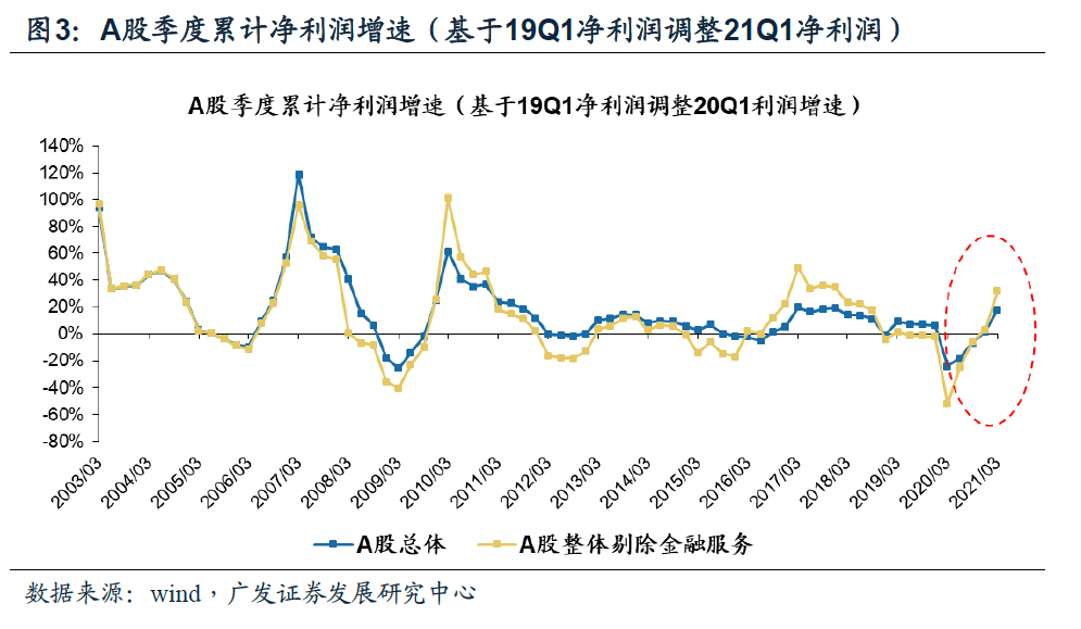 ●剔除低基数效应后,A股一季报盈利增速仍显著改善。我们用19Q1的净利润调整计算21Q1的净利润同比增速:A股整体一季报利润增速17.98%(年报利润增速1.76%);A股剔除金融一季报利润增速32.01%(年报利润增速3.27%)。