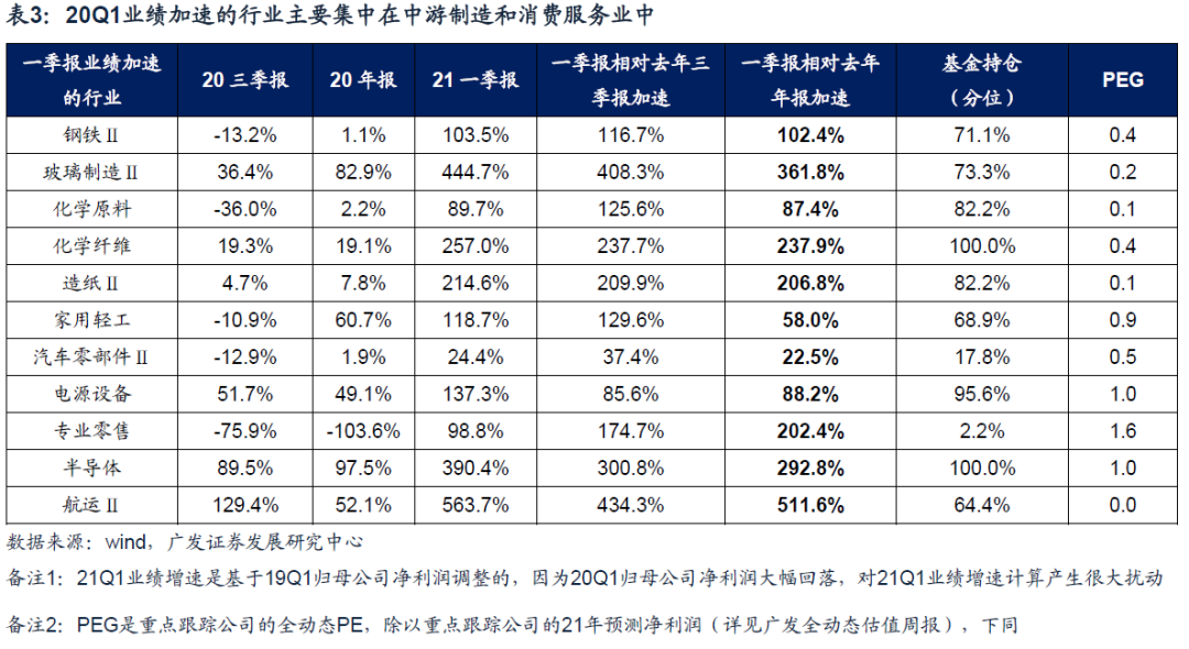 (1)一季报盈利增速相对于去年年报和去年三季报同时加速的行业主要分布在:出口链的中游制造(玻璃/化学原料/化学纤维/家用轻工/汽车零部件)以及出行链的消费服务业(专业零售/航运);