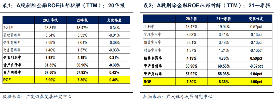 ●ROE继续回升:疫苗落地改善周转率,“供需缺口”驱动利润率。A股剔除金融21一季报ROE(TTM)为8.36%,相对于20年报的7.30%上行1.06pct。在杜邦三因素中,周转率和利润率共同驱动ROE持续改善:疫苗落地内外需修复,21一季报的利润率显著改善1.04pct;“供需缺口”驱动企业的毛利率回升,21一季报的利润率继续改善0.59pct。