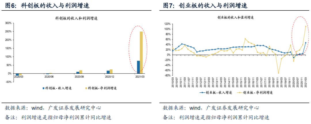 ●科创板、创业板的收入和利润增速均大幅提升。科创板一季报收入增速75.78%(年报收入增速17.22%);科创板一季报利润增速249.72%(年报利润增速24.62%)。创业板一季报收入增速46.99%(年报收入增速4.57%);创业板一季报利润增速110.4%(年报利润增速39.6%)。
