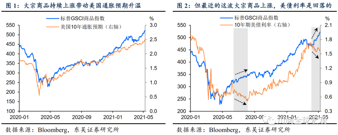 自我们4月25日发表《迎接又一波大宗商品上涨》以来,伴随着铜价创历史新高,大宗商品的这波涨势正酣。然而,在通胀预期随着这波大宗上涨不断升温的同时(图1),美债的长端利率却是回落的。我们注意到类似的现象在2020年6-7月也出现过(图2)。
