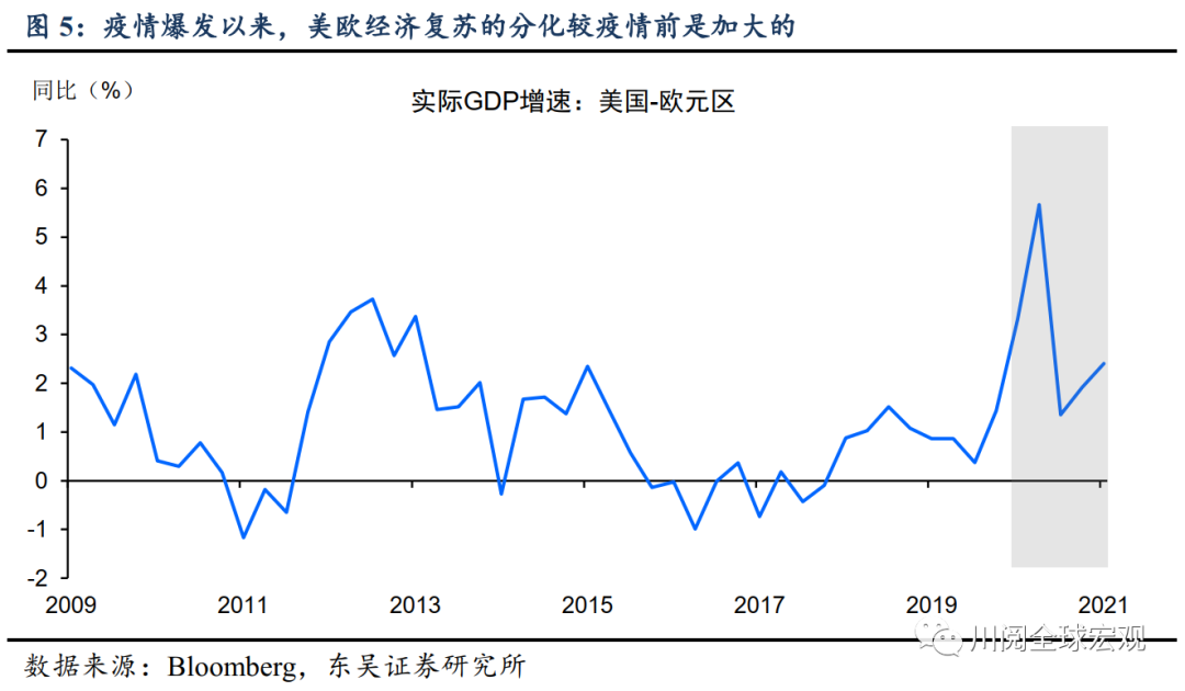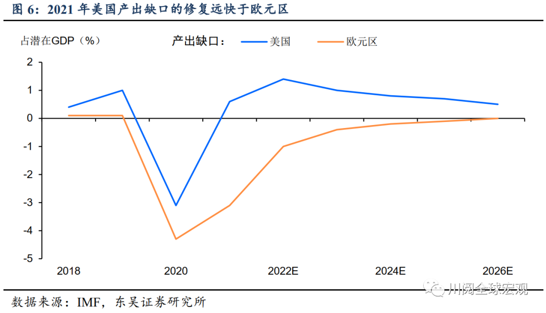 那么下半年美欧经济的分化会消除吗?我们认为不会,一个重要的原因,是金融危机后欧元区在经济周期上相对美国更加滞后了。这背后有很多结构性的因素,而疫情爆发后美欧在财政刺激上差异,更是加剧了这种滞后。根据IMF的最新估算,美国经济产出缺口有望在今年转正,而欧元区经济产出缺口转正则要到2026年,由此不难计算,今年美国经济向潜在产出修复的速度至少是欧元区的三倍(图6)。