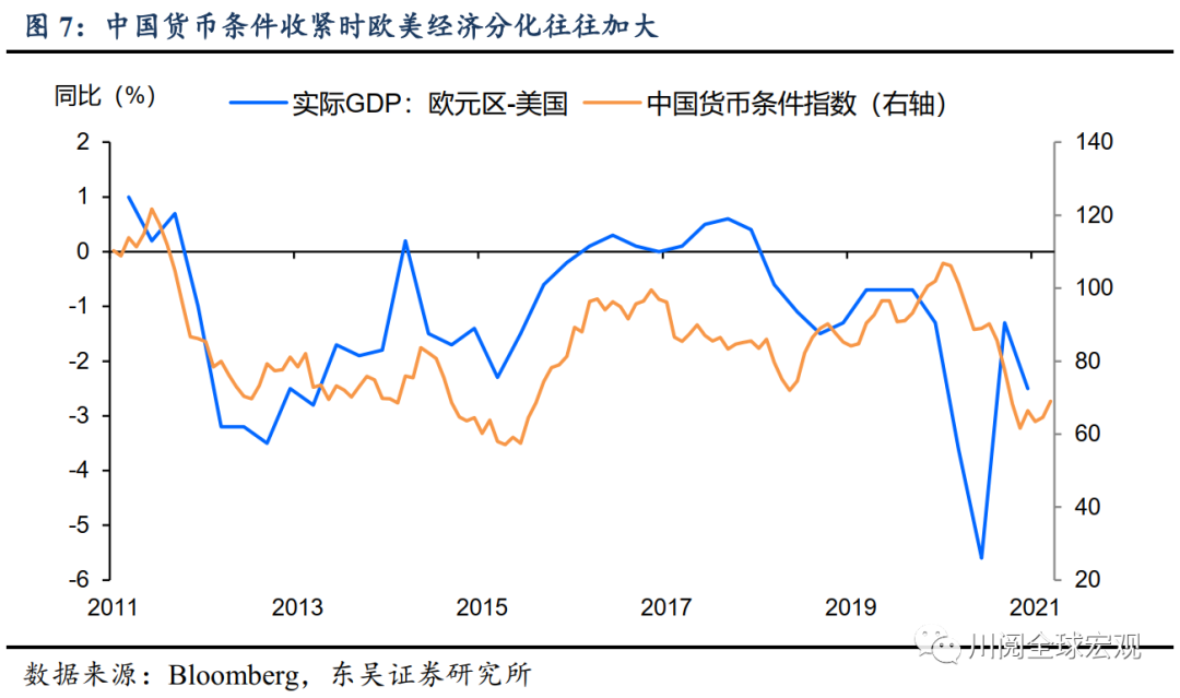 美欧经济分化也受到中国货币条件的影响。历史上当中国的货币条件趋于宽松时,欧元区相对美国在GDP增速上的差距会缩小(图7),这是因为欧元区作为外向型经济体,比美国更受益于中国的货币宽松。但当前中国经济已经走出疫情,因此下半年货币条件难有进一步宽松。