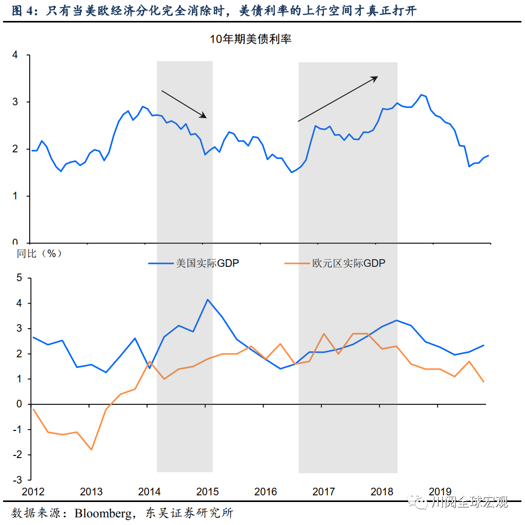 对美债利率而言,我们发现美欧经济的分化程度是一个重要的影响变量。比如2013年美债利率虽然因美联储的削减恐慌迎来一波上行,但随后的一年则拐头向下(图4),其背后的原因便是2014年美欧经济在复苏上的分化加剧,资金回流美国压低了美债利率。