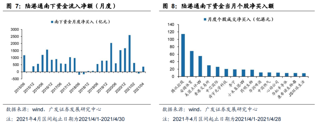 南向资金方面,4月南下资金合计净流入363亿元。其中,净买入个股前五为腾讯控股、安踏体育、美团点评-W、香港交易所、中芯国际。