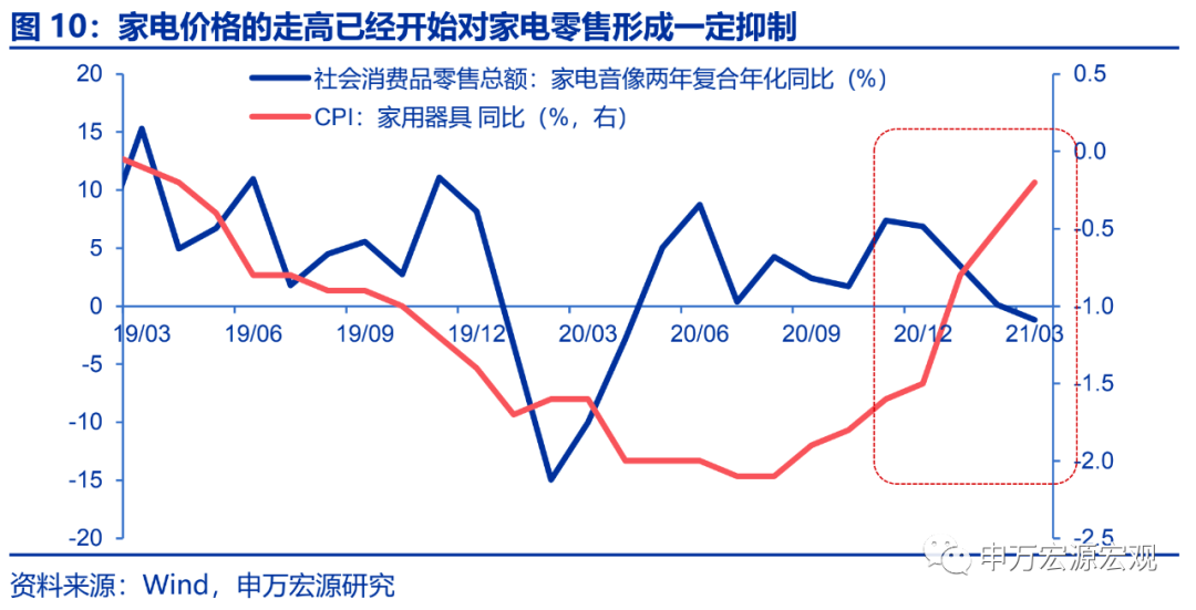 当前工业品价格上涨过快,已经开始冲击到实体经济的需求,特别是今年本来是地产产业链行进至竣工交付高峰、自然拉动耐用可选商品升级的一个黄金时期,如果因为工业品价格上涨过快,传导至耐用消费品领域,反向抑制了耐用消费品需求,以至于影响了我国的双峰复苏结构的韧性和可持续性,将成为大家都不愿看到的得不偿失的局面。