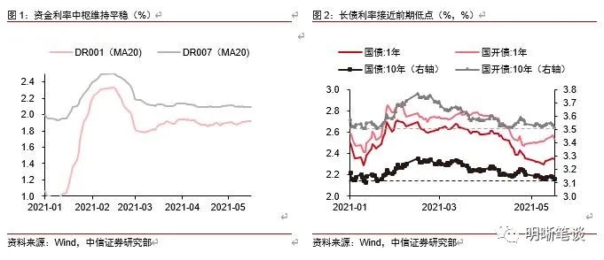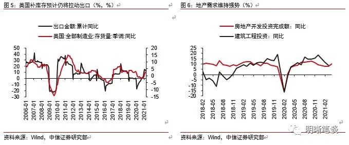 短期内经济基本面仍然维持偏强运行,政策目标或仍然以防风险为主。工业生产、地产投资维持强势,制造业投资温和复苏,商品消费超季节性回落。短期来看,预计工业生产热度不减,消费和服务业依然是最需关注的边际变量。另一方面,目前经济的表现可以看出外强内弱的结构,与外部经济相关的出口、工业生产、制造业投资景气度高,而国内的基建、消费需求较弱。而美国从2020Q4启动补库存,历史上从美国开始补库存到我国出口增速见顶时间间隔约为3-8个月,三季度前出口高增预计将持续;于此同时内部消费需求也将逐步回暖,制造业投资增速进一步回升也难以证伪,因而二、三季度政策的目标重心可能都不在经济基本面上,可能更多是防范化解债务风险。当然,需要关注上游大宗商品价格快速上涨可能对基本面的负面影响。