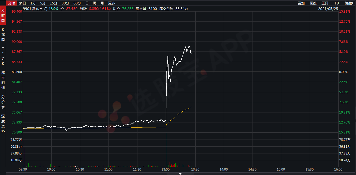 5月25日,港股教育股午后逆转,新东方一度从-12到+5%,爆拉17个点,新东方在线、东软教育等也纷纷大幅跟涨。