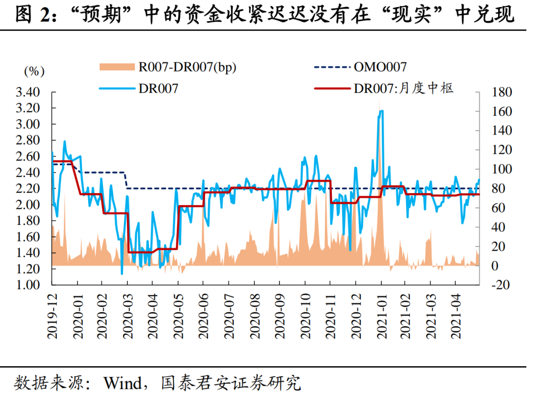 但是,为什么国内债市反而走出了慢牛行情?原因在于市场“预期”中的资金面收紧迟迟没有在“现实”中兑现,从而导致利率超预期的下行。