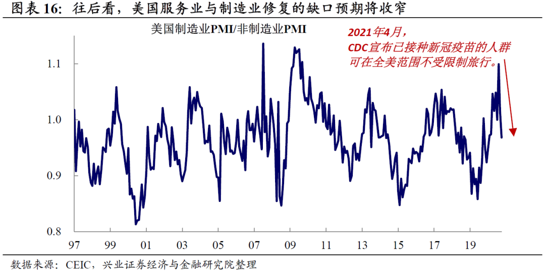 伴随着疫情约束放开,此前有缺口的服务业或将开始修复。镜子的另一面是,受到前期疫情的扰动,美国服务消费部分当前仍有较大缺口,尤其是交通、娱乐消费仍低于疫情前水平20%以上(详参图表6)。因此,伴随着防疫政策的放开,美国服务业的修复缺口预期将进一步闭合:2021年2月以来,美国制造业PMI与非制造业PMI的比值已经快速下降。