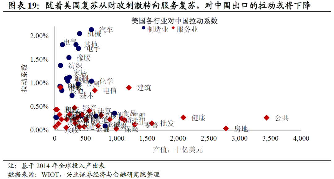 考虑到服务消费拉动小于商品消费,美国需求对出口拉动或将下降。作为本轮新冠冲击的主要需求提供方,美国政府的财政刺激高峰已过,全球复苏的核心逻辑可能逐渐从商品消费复苏转向服务业的逐渐恢复,从全球投入产出表来看,美国服务业对中国的拉动系数也明显较低,这意味着对中国出口的拉动可能逐渐下降。从这个角度而言,外需消费品对中国出口的拉动或正在进入中后期。