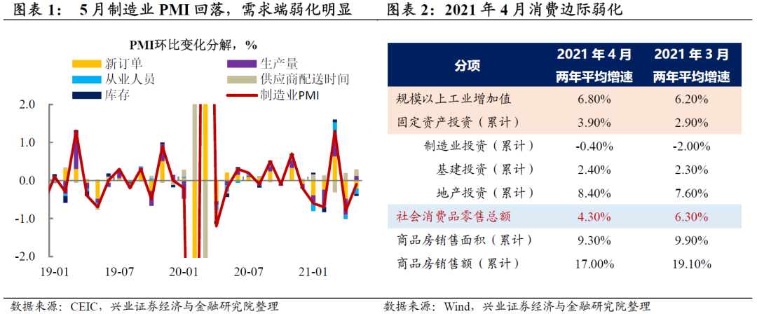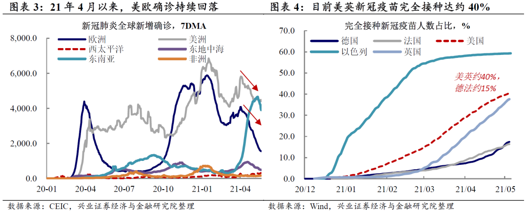 内需转弱,美欧疫情好转,大家开始关注下半年外需能否支撑经济。随着疫情后国内经济跌深反弹的韧性接近尾声,近期经济增速逐渐往中长期中枢回落,2021年4-5月份PMI出现见顶回落。从三驾马车的拉动来看,基建拉动消退,严监管下房地产热度逐渐降温,国内消费也出现走弱,尤其是可选消费弱化程度更大。在内需转弱的背景下,美欧疫情持续好转,大家开始关注下半年外需能否支撑经济。