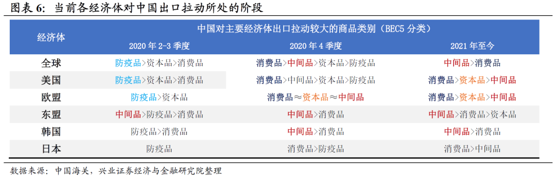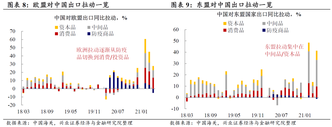 ③欧盟:消费和生产双轮驱动。相对美国而言,欧盟的出口拉动较为平衡,消费品和中间品/资本品贡献各约占一半,显示欧洲出口链条的生产的恢复并不慢于美国。