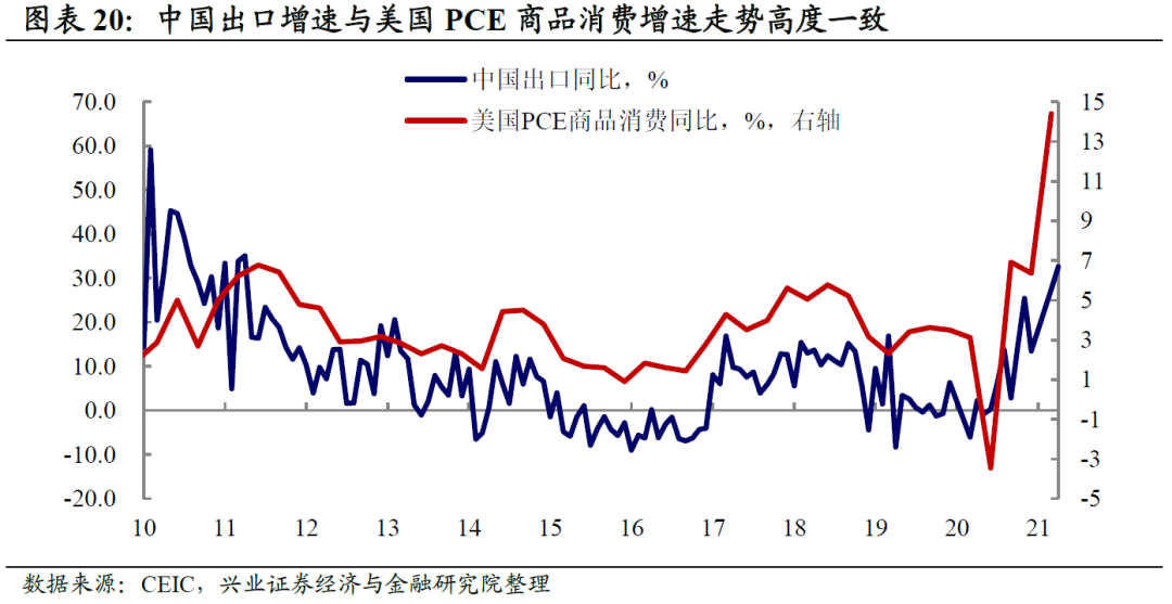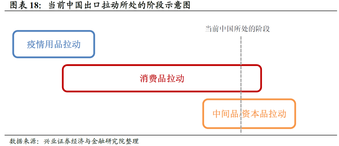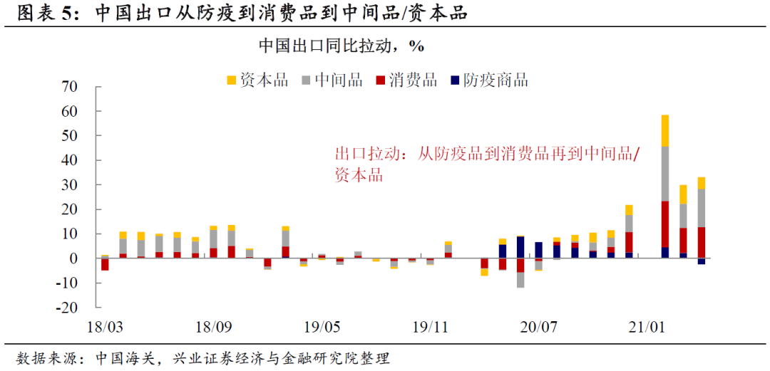 外需对中国出口的拉动可能进入中后期。我们曾指出,中国出口受益可能包括三个阶段:1)2020年2-3季度,防疫品是中国出口的主要拉动;2)2020年4季度以来,海外生产能力供需错配拉动中国消费品出口大幅增长;3)2020年末开始,随着全球生产链条逐渐恢复,中间品和资本品出口也出现快速上升,形成新的外需贡献。而随着全球复苏的核心逻辑逐渐从商品消费转向服务消费,当前中国出口或已处于消费品拉动阶段的中后期。