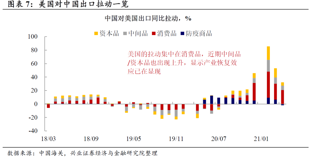 整体来看,中国出口经历了“防疫品→消费品→中间品”拉动的依次上升。2020年以来,在新冠疫情的冲击下,中国经济率先复苏,中国制造为全球提供了生产能力,出口增速快速提升。我们在年初报告中曾展望,2020年以来中国出口的受益逻辑可能包括三个阶段:1)2020年2-3季度,防疫品是中国出口的主要拉动;2)2020年4季度以来,海外财政刺激尤其是美国导致商品需求激增,而海外供应能力不足,供需错配拉动中国消费品出口大幅增长;3)2020年末以来,随着全球生产链条逐渐恢复,中间品和资本品出口也出现快速上升,形成新的外需贡献。