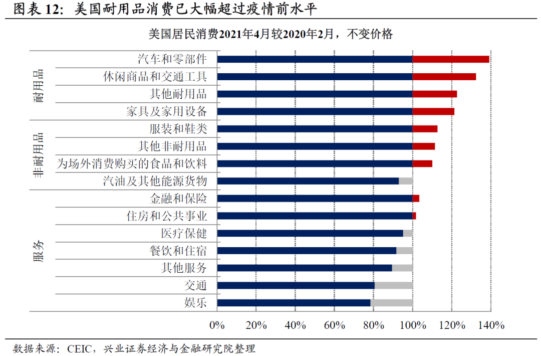 美国耐用品消费大幅超过疫情前水平,消费需求或部分透支。当前美国商品消费,尤其是耐用品消费各项均已超过疫情前水平20%以上,多轮财政刺激造成的耐用品消费旺盛,或已部分透支美国耐用品未来的消费需求。