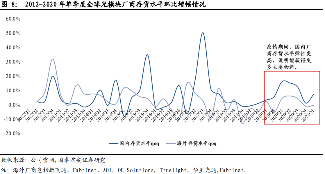①从存货来看,国内厂商存货环比增幅水平远高于海外主要厂商,主要原因在于国内受疫情影响小,供应链向国内倾斜,同时也显示国内对光模块产业链订单前景保持乐观。