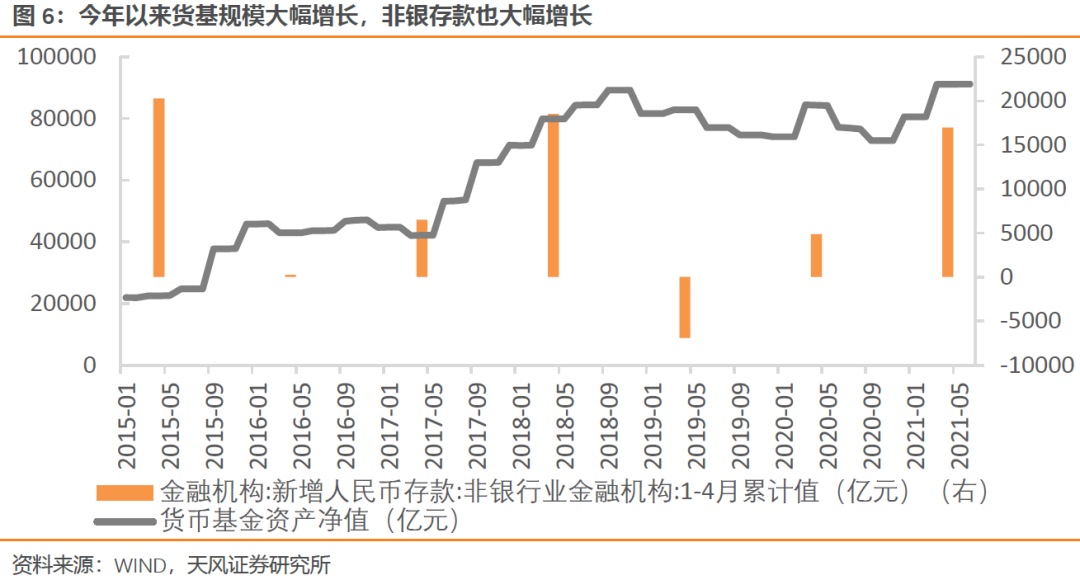 受权益市场波动、实体投资需求减弱等影响,今年货币基金规模大幅增长,去年12月以来已经增长1.8万亿。这带来两种效应:一是非银本身的流动性储备比较充足,1-4月非银存款累计大幅增长1.7万亿,是2018年以来的最高值,减弱了非银的流动性需求,R007与DR007之差处于历史低位;二是货基扩张提升了非银对存单的配置需求,补充了银行的中长期负债,推动存单利率下行的同时稳定了银行负债预期。