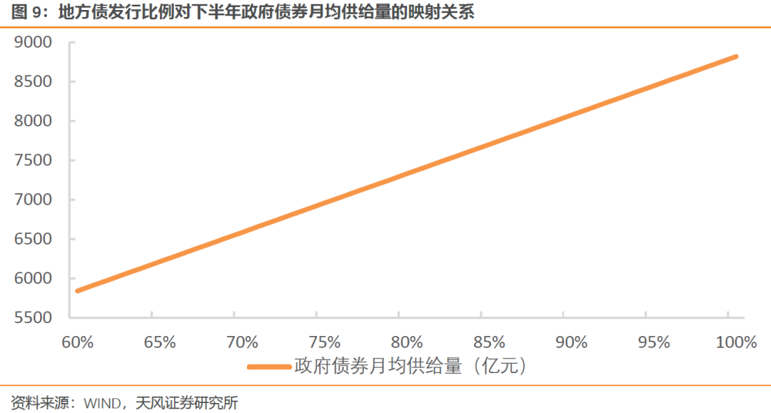 对于下半年,假设国债足额发行,如果今年地方债全年发行预算新增额度的80%,则下半年政府债券的月均供给量为7300亿;如果发行90%,则月均供给为8100亿;如果发行100%,则月均供给为8800亿。