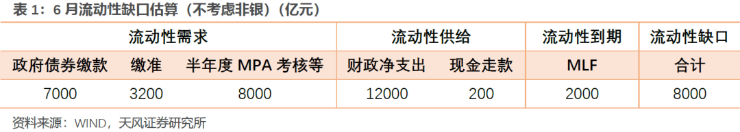 综上,预计6月的流动性供需缺口大约在6000亿,加上6月15日MLF到期2000亿,合计约8000亿。如果考虑非银的流动性储备,实际缺口可能稍偏低,但不足以完全弥合。